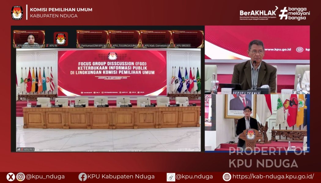 Wamena, 22 September 2025 - Komisi Pemilihan Umum (KPU) Nduga mengikuti Focus Group Disscussion (FGD) Keterbukaan Informasi Publik yang diadakan KPU RI. Kegiatan diikuti oleh Kepala Sub Bagian Partisipasi, Hubungan Masyarakat, serta operator website PPID PPID Nduga setiap satuan kerja.